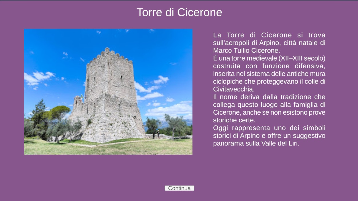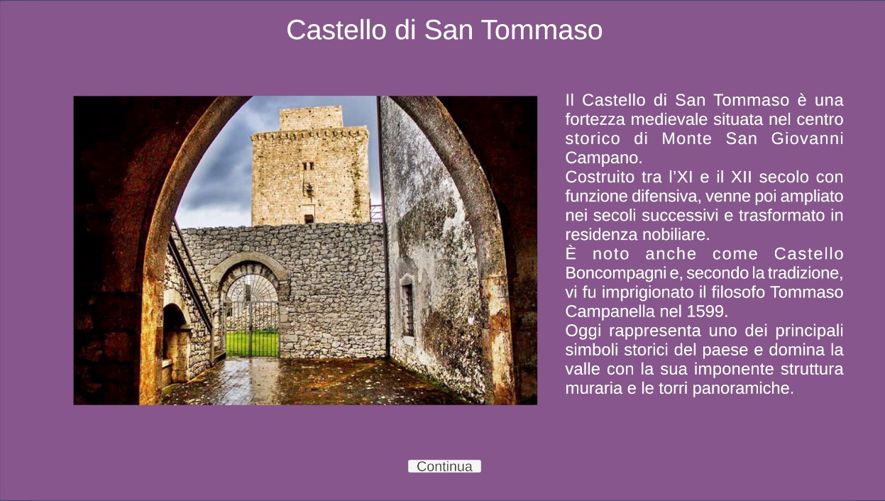 Un gioco educativo e coinvolgente ambientato a Monte San Giovanni Campano, in cui il giocatore viene guidato alla scoperta del territorio attraverso tre minipuzzle ispirati ai luoghi più rappresentativi del paese. Ogni sfida è legata a un ambiente reale e propone un puzzle che stimolano logica, osservazione e capacità di problem solving.